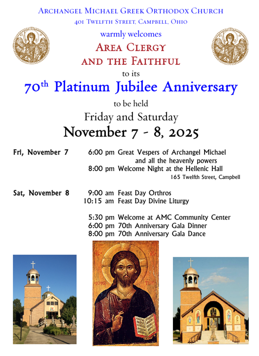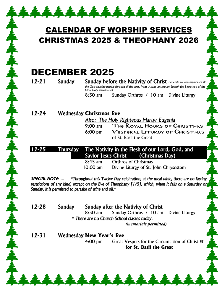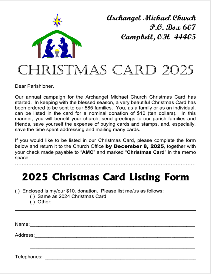 For information on our seasonal liturgical services please contact the Church office at 330-755-3596 between the hours of 9:00 AM - 3:00 PM, Monday through Thursday. If you call outside of office hours, just press 4 to hear the calendar of services.