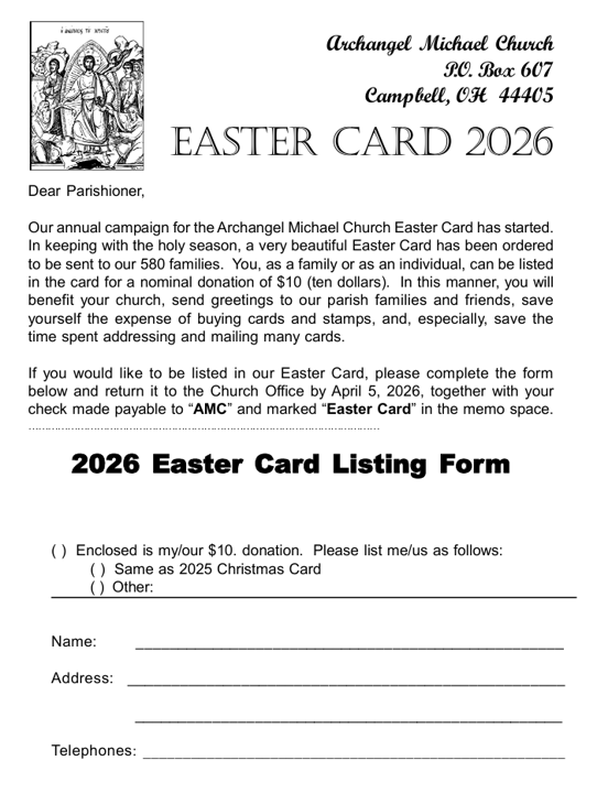 For information on our seasonal liturgical services please contact the Church office at 330-755-3596 between the hours of 9:00 AM - 3:00 PM, Monday through Friday. If you call outside of office hours, just press 4 to hear the calendar of services.